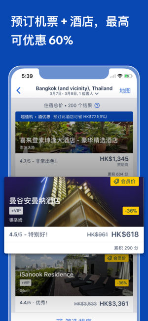 您現可用 Expedia App 預訂酒店、機票和活動!由計劃行程到預訂和出發,Expedia App 都是為提升您的旅遊體驗而設計。 Expedia 幫助您尋找最佳的度假方案。透過我們的各種途徑,幫您尋找便宜的機票、酒店和活動。 用 Expedia 預訂行程,省錢又能享受獨家優惠和折扣! 快速預訂行程,並獲取獎賞: - 幫您搜尋所有地點的平價酒店 - 購買所有目的地的機票 - 每次預訂都能賺取更多獎勵! - Expedia 就是您的旅遊嚮導。 - 手機/平板尊享酒店優惠低至 6 折。 - 只需輸入航班出發和抵達資料即可找到心水航班。 - 用 App 預訂可賺取 2 倍 Expedia+…