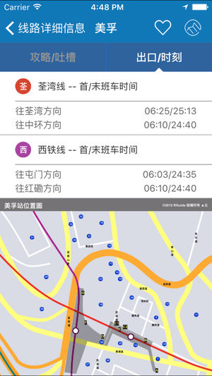 ----老牌地铁查询应用,累积超过1000万用户的出行选择---- rGuide是Route Guide的简写,意为路线指引,专门提供本地出行、旅游交通的路线指引以及地铁周边多样的消费指南服务。 【主要功能】 ◆操作最简便:无论是查询车程还是车站资料,最快只需点击2次即可完成! ◆选站最快速:独创的GPS自动定位、线路图直接点击、站名地标搜索,总让您以最快速度选到车站! ◆离线车站交互式地图,信息最完整:除了调用标准地图服务外,提供独家出口地标及街道离线地图! ◆最早/最晚出发时间:rGuide独创,智能计算您可到达目的站的最早/最晚地铁搭乘时间! ◆多种语言选择:三种语言界面,通行两…