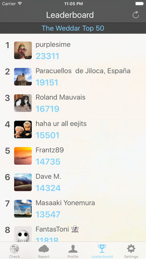 纽约时报 “Weddar提供的聪明的界面和非常简单的用户体验,以及它的功能集的有用性保证我们将看到吸引力在世界各地稳步增长,更多的人发现这个App Store宝石” 有线 “Weddar报告:iPhone应用程序是Twitter的天气”; “想想Weddar,今天推出,像FourSquare或Instagram,只为天气”; “一个简单,容易的界面。 Mashable “Weddar最大的质量是它是超地方的”; “...应用程序的众包和移动性质可以给它一个边缘,如果想法开始与足够的iPhone用户”; Gizmodo(应用程序的一天) “应用程序的设计很好,报告天气的UI很简单,有吸引力…