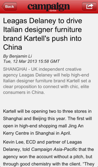 Campaign Asia-Pacific is an industry brand dedicated to the business of communication in Asia-Pacific. The vision of Campaign Asia-Pacific is to be a seamless and essential news, insight and research network for advertising, marketing, media and PR professionals across region. Across platforms, the brand delivers deep and broad analysis of industry trends, insights, developments and issues, making it a must-read for the decision-makers driving agencies, brands and suppliers. The title is also packed with case studies to inspire and inform junior-level staff who are keen to learn and progress in their careers. More than 130,000 industry members access Campaign Asia-Pacific’s content every month. CampaignAsia - Daily news & headlines plus the magazine highlight 12 months subscription (US 34.99) - 12 months of daily news & headlines 30 days access (US 4.99) - 30 days of daily news & headlines Remark: - Purchasing the Campaign iphone/ipad app via Apple does does NOT automatically give you access to our ONLINE website. To access Campaign across all platforms subscribe to our FULL package on our website and log in to the iphone app and ipad app for free. - Payment will be charged to iTunes Account at confirmation of purchase - Subscription automatically renews unless auto-renew is turned off at least 24-hours before the end of the current period - Account will be charged for renewal within 24-hours prior to the end of the current period, and identify the cost of the renewal - Subscriptions may be managed by the user and auto-renewal may be turned off by going to the user’s Account Settings after purchase - No cancellation of the current subscription is allowed during active subscription period - Terms and condition :http://www.campaignasia.com/Page/TermsAndConditions.aspx - Privacy Policy :http://www.campaignasia.com/Page/PrivacyPolicy.aspx