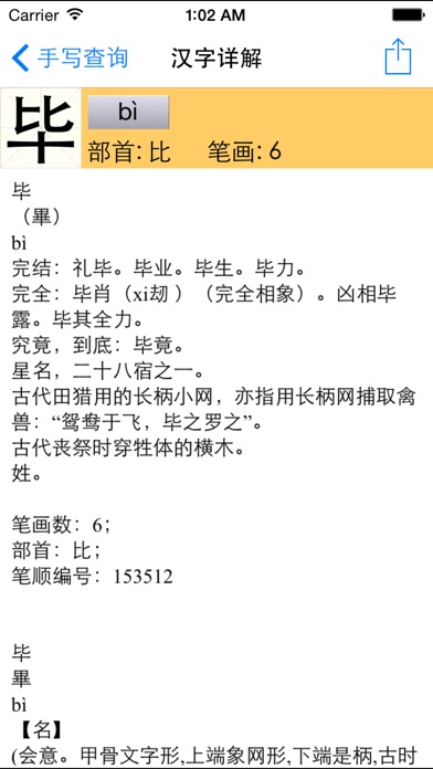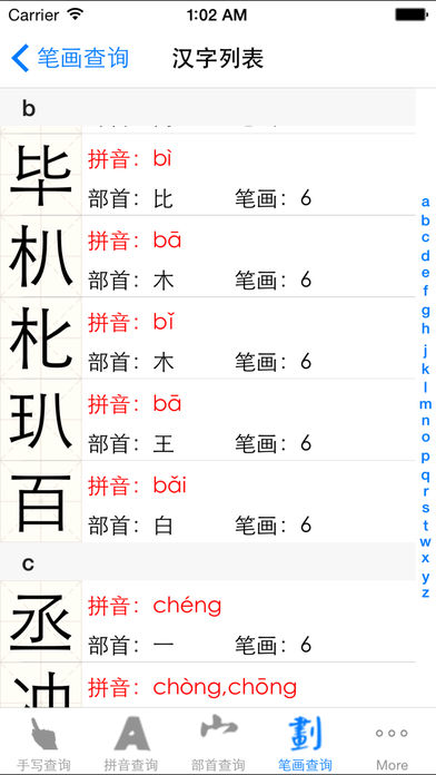 某些用户反应有的字,如“存”字写不出来,请注意正确的笔顺和笔画,“子”应为三画。 ※※※※※ 有可能是最好用的新华字典App ※※※※※ 本新华字典的设计理念是:让用户用最快的速度查询到自己想查的汉字。 为了尽量减少用户自己输入节省时间,本App具有笔画,拼音,部首索引功能。 另外,使用本App还可以输入带四声的拼音,或利用系统输入法输入汉字,或直接利用我们自身研发的手写功能进行精确查询。 功能: 1,全部本地操作,不需要网络环境。 2,书签功能。 3,内置两种手写查询功能 4,可以根据拼音,笔画或部首索引,对每个汉字进行查阅。 5. 配有索引, 让您快速找到想查的汉字。 6. 在汉字详细画面,可以选择发送邮件或者复制来保存该汉字的详细信息。 7. 为6000个常用汉字配有两种笔顺动画演示。 8. 在汉字详细画面,所有汉字均可以扩大显示。 9. 真人语音发音 10. 正体字/简体字自动转换功能。 如升级新版本后无法正常使用,请删除后重新安装即可。 可以识别不同笔顺,并且字库也将覆盖所有汉字,敬请期待下一版本。