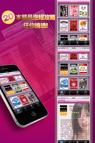 无论你自身条件如何,只要用心研习《追女秘籍》,必能抱得美人归! 你是否不懂得如何与陌生女孩搭讪? 一遇到漂亮女孩就手心出汗舌头僵硬? 暗恋她却不知道如何去追,直到她叫别人“老公”才后悔? 不知道如何洞察女孩的心思? 不知道如何在女孩面前展示自己的魅力? 不知道如何和女孩身体接触? 其实,我们要告诉你:无论你相貌、财富、年龄、身高, 无论你是否有基础,无论你是否有钱,你都可以使用一套不可思议的简单方法,让美女们投怀送抱!任何人都可以做到,只要你步步为营,巧妙变通,一定能把心仪MM追到手,开心抱得美人归! 别傻愣着了,再犹豫一秒钟你心爱的女孩就被别人追到手了,赶紧下载本合集,告别单身,拥有美女! ------------------------------------ 书籍列表 宅男脱光手册 超级约会学 失恋33天 低成本泡妞 泡妞专家 那些年,我们一起追女孩 交往技巧与心理学 我的同居美女上司 男人这东西 女人这东西 爱情心理学 无财无貌怎么泡美女 恋爱教科书 爱的五种语言 把妹达人 指男针 约会倍增术 搭讪圣经 男生必读:追女宝典 男人来自火星,女人来自金星 网络泡妞终极版 狼族圣经 泡妞三十六计 情场致胜秘密 把妹达人之迷男方法 QQ泡妞一本经 ------------------------------------ appsbooks微博平台全面开通,我们将在微博中开展各类活动,每位关注appsbooks微博的用户均有机会赢得推广码! 新浪微博 http://weibo.com/2185148310 搜狐微博 http://t.sohu.com/u/151680248 腾讯微博 http://t.qq.com/a888999-gao ------------------------------------