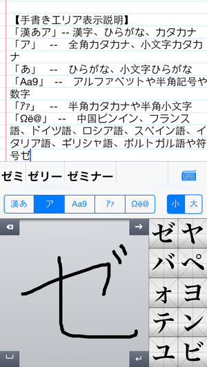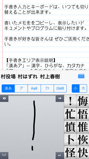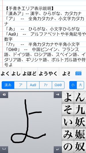 iPhoneで手書き文字を認識してくれるアプリです。 このアプリを利用して、快適な入力や編集作業を実現している、漢字、平仮名、片仮名、半角カタカナ、英数字、小文字と中国ピンインが含まれている多種類の手書き文字が認識できます。 1文字目の入力時点から、リアルタイムにつながり予測候補リストが表示されます。 手書き入力とキーボードは、いつでも切り替えることが出来ます。 書いたメモををコピーし、表示したいドキュメントやプログラムに貼り付けます。 手書きが好きな皆さんは ぜひご活用ください。 【手書きエリア表示説明】 「漢あ」-- 漢字、ひらがな、全角記号 「あ」-- 全角ひらがな、小文…