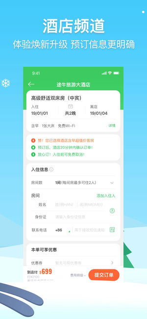 【产品简介】 途牛旅游——让旅游更简单,让出行更方便! 途牛旅游APP,为全国上百个城市,提供7x24小时服务!累计出游人数5800万+人次,400万+条真实点评,用户满意度高达95%! 每天N条特价线路,让你想买就买说走就走! 【途牛旅游】 随时随地预订酒店、机票、火车票、汽车票、景点门票、出境游、跟团游、周边游、自由行、自驾游、邮轮、租车、公司旅游、婚纱旅拍等,产品全面,价格透明,各种旅游度假产品任你选。 APP提供快捷电话服务,享受24小时电话服务的安心旅程,出游归来点评还送现金,途牛和你才是真爱! 【特色功能】 1. 手机特卖:限时秒杀、尾货特价、预售钜惠、超值爆款、专场精选,品质…