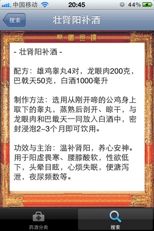 在我国古代,酒曾被视作一种药物,除了作为饮用品外,其最大的作用就是用以来治疗疾病。酒是用谷类和酒曲酿制而成,其气剽悍而质清,味甘辛而性热,无毒,具有温通血脉,益脾暖胃,开结化瘀,利筋骨,舒关节,润皮肤,去寒湿等功效。班固在《前汉书·食货志》中就称酒为“百药之长”。上古时候,医生看病,常用酒来治疗疾病。古时“醫”字从酉(酒),即说明酒与医药的密切关系。 药酒属于配制酒,是加入中药的酒,它是酒与中草药结合在一起,经过一定的加工,制成的澄明液体。商代甲骨文中有“鬯其酒”,“鬯”,据班固注解:“以百草之香郁金合而酿之”,这可能是目前最早的的用中药制酒的记载。长沙马王堆汉墓出土的“五十二病方”记载…