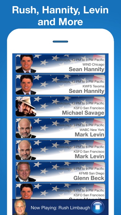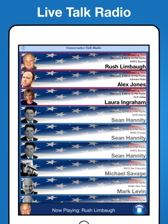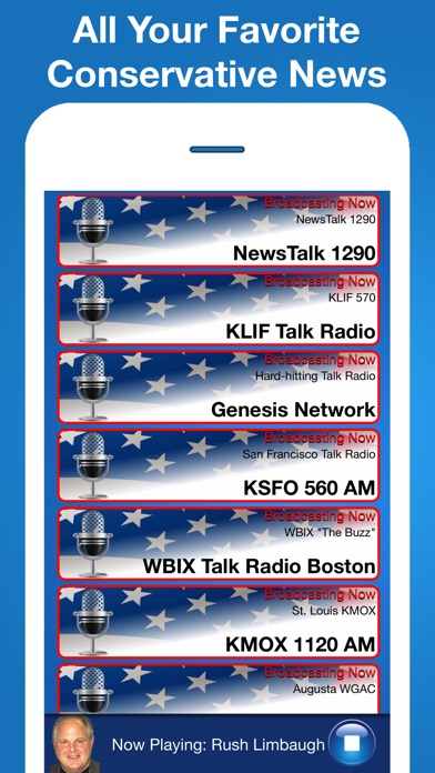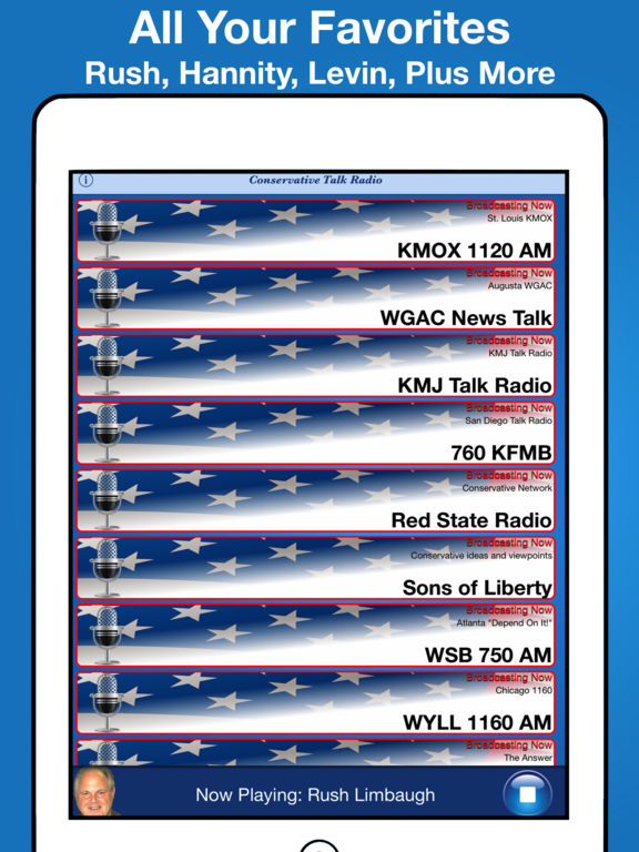 **** SUPER SALE! PRICE GOES BACK TO $5.99 IN A FEW DAYS! **** **** CONSERVATIVE TALK RADIO IS THE #1 TALK RADIO APP IN THE APP STORE! **** From the makers of the critically acclaimed Proud Republican app, we bring you Conservative Talk Radio. The best source for conservative talk radio. Use this app to tune-in to all your favorite conservative news radio shows and listen to them live! Includes access to individual radio shows, as well as the top news radio stations. Includes streaming access to the following talk radio shows: - Rush Limbaugh - Glenn Beck - Michael Savage - Sean Hannity - Laura Ingraham - Mark Levin - Alex Jones - Weekend Best of Rush Limbaugh - Weekend Best of Glenn Beck FEATURES: - Background play - Intuitive interface - Best conservative talk radio shows - Instant streaming access