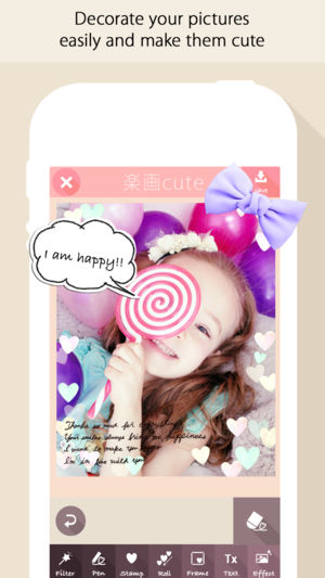 在全世界拥有450万用户的免费涂鸦APP的最终版本! 更新后支持iPhone6,更可爱,使用更简单。 ===================================== “乐画cute”是用自制大头贴机器的涂鸦素材,来装饰照片、加工图像的APP。 ===================================== 〇此处是推荐要点 ・支持iPhone6,不影响画质,让您在漂亮的照片上能够自由涂鸦。 ・满载自制大头贴机器的可爱装饰素材,更有贴图、滚滚、相框、添加文字等功能! ・霓虹、中空、半透明、添加阴影、有花色、粉彩等“笔”的种类是涂鸦类APP中最丰富的! ・执着于易书写…