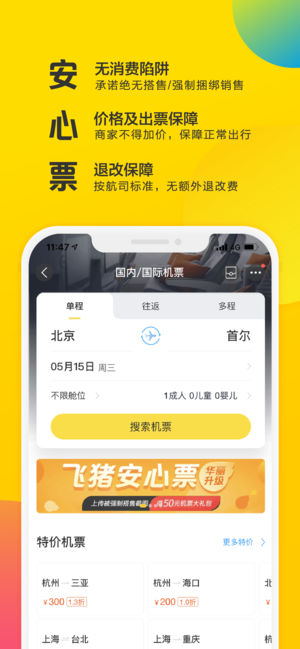 飞猪--享受大不同! 飞猪是阿里巴巴集团旗下旅行品牌,提供机票、酒店、火车票、汽车票、景点门票、用车、周末游、跟团游、自由行、自驾游、邮轮、旅游度假产品任您选!精选攻略、出行保险,旨在为您提供优惠、便捷、高性价比的出行服务。 飞猪App供国内及海外20万余家酒店、民宿、客栈、酒店式公寓在线预订服务;提供10万多条国内及出境旅游线路,并提供电话卡、境外Wi-Fi、租车、签证等一站式服务;全覆盖国内外6000多家付费景点门票,线上预订一键预约;提供国内所有航线和国际绝大多数主流航线机票、国内所有火车票的在线订购。 [精彩活动] 1.「春运购票」春运火车票预订,随机立减,最高68元; 2.「特…