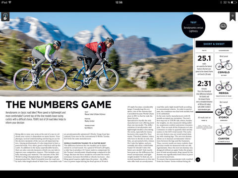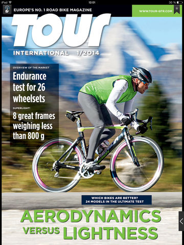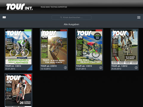Try out the new TOUR international App with the latest in road bike tests, reviews and articles. TOUR international is from TOUR, Europe’s No. 1 road bike magazine, published in Germany. Our large staff of editors is well known in the industry for being meticulous and exact, independent and fair. But until now, you could only get TOUR in German. Not any more! Published online in English four times a year, TOUR international is aimed at an international audience. We offer in-depth road bike testing and reviews that you can’t get anyplace else. We do lab tests, riding comparisons and extensive wind tunnel tests. Our reviews are accurate, detailed and we don’t pull any punches; if there’s a problem with a bike or a component, we’ll let you know. You can now receive the essence of TOUR, including all our major tests, on your iPad. The App itself is free, you simply pay for each issue of TOUR international that you choose to download. Optional Subscriptions are available: 3 Months 6,99 Euro 6 Months 13,99 Euro 1 Year 26,99 Euro