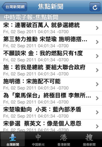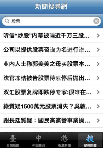 想知道最新的中港台和国际新闻吗? 本程式提供您来自台湾,中国,香港,和其它国际间的最新和最快之新闻报导。 内容包括: - 焦点新闻 - 政治新闻 - 财经新闻 - 社会新闻 - 国际新闻 - 两岸新闻 - 地方新闻 - 科技新闻 - 娱乐新闻 - 体育新闻 - 健康新闻 - 教育新闻 - 旅游新闻 - 新奇新闻 - 生活新闻 - ... 程式将会定期更新以便提供您更多的中文新闻来源和功能,让您随时掌握最新的新闻,成为中文新闻通! ------------------------- Aggregator of news articles in Chinese language (from Taiwan, China, and Hong Kong).