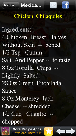 A Big Collection of 190 Mexican Recipes! Plus Enjoy App Features Like: =>> Email Share =>> Facebook Share =>> Favorites Among the world's great cuisines, the foods of Mexico stand out in their diversity. Rooted in a history of ancient Indian civilizations, inspired by the Spanish Conquistadores of the sixteenth century, and influenced by European tastes in the later revolutionary years, it is a dynamic cuisine, adaptable but remarkably complete even in its melding of different cultures. Explore Mexican cooking in all its delicious variety with this outstanding recipe collection for today's home cook. You'll find traditional favorites like: * ACAPULCO CHICKEN * FRIJOLES DE OLLA (BEANS COOKED IN A POT) * CARNE ASADO (MEXICAN STYLE BEEF TIPS & GRAVY) * CHALUPA * CHICKEN ALEJANDRO * CHICKEN ENCHILADAS WITH PASILLA CHILI SAUCE * CHICKEN OR BEEF FAJITAS * CHILES RELLENOS (FRIED STUFFED CHILES) * CHILI POBLANO PIE * CHIMICHANGAS SUPREME * EL CHICO SALSA VERDE * ENCHILADAS BANDERAS * GRILLED CHICKEN ADOBO * GRILLED CHICKEN QUESADILLAS * SUPPER NACHOS * RICE CON QUESO * And Over 180 More!! => Complete App Features: >> 190 Easy to Make Recipes! >> Easy Browsing of Recipes! >> Fast Loading Pages! >> No Internet Connection Required! >> Mark Recipe as Favorite! >> Share Recipe via Email! >> Share Recipe via Facebook! >> Universal App (Works with iPod, iPad & iPhone) Download it Now!