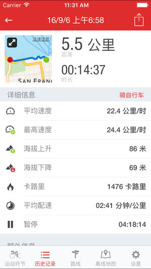 App专业版的功能与福利: - 通过GPS来追踪骑行的距离、时长、速度、海拔、配速、卡路里等 - 实时追踪与加油:在骑行时,向你的好友们现时展示你的方位与你的骑行速度,并让他们为你加油 - 语音指导:你速度、距离、海拔升高等数据方面的信息播报 - 路线搜索:路线搜索:浏览并搜索数以千计的骑行路线 - 包括海拔档案信息在内的你自行车路线方面的详细图表展示 - 公开街道地图及公开骑行地图与应用的整合 - 离线地图:下载地图并保存在你的iPhone上,在国外或无网络连接时可用 - 标有颜色的运动轨迹:速度、海拔、爬升率、心率等 - 在行程期间展示你当前的爬升率,海拔升高/分 - 以%形式显示当前的…