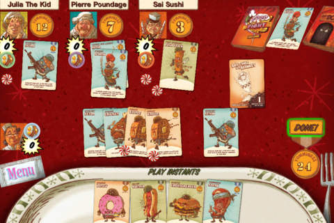 Food Fight iOS makes mobile gaming tasty! In Food Fight iOS players recruit fighting entrees and side dishes to build a battling meal for the ultimate food fight. Choose delicious and deadly entrees that will devour the competition; enlist Major Weiner and Private Pancake to team up with Mean Burrito, fortify your troops with side dishes and condiments and prepare to do battle; but beware! That sound you hear might be the Dog! And the Dog is always hungry... Food Fight iOS brings the original card game to life and featuring the original’s Draft mechanic. Food Fight iOS also presents a quicker Boot Camp mode and an innovative, iOS specific, Campaign Mode. Play against others online or via hot-seat, or against the AI in offline mode. The epic Campaign Mode let’s you battle across the land, defeating the Snack King Mascots in order to build your ultimate End Game Army. Your End Game Army had better be delicious, as you’ll soon face the dreaded Disposalor in the Under Whirled in the final battles for Breakfast, Lunch and Dinner. Play Offline •1-4 players •Hot-seat versus 1-3 others •Versus 1-3 AI players •Campaign Mode Play Online •2-4 players •Asynchronous play •Find and create online games •Player Profile to track your record Features •Instructional tutorial •Maintain and save multiple games •Boot Camp and Draft Modes •Game Center achievements in offline (non-campaign) mode Find us on Facebook and Twitter. Also by Playdek Penny Arcade The Game: Gamers vs Evil; Fluxx; Can’t Stop; Summoner Wars; Ascension: Chronicle of the Godslayer; Nightfall