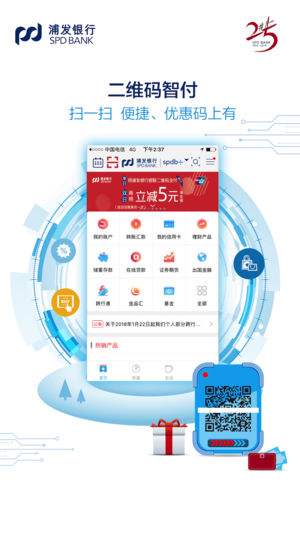 浦发银行发布国内首款智能APP,全面拥抱数字化新时代: 【智能语音交互】在与用户的会话交互过程中实现智能语义理解并唤起相应的APP功能菜单 【人脸识别】体验“刷脸”登录App、大额转账,提升互联网金融贷款提款体验 【极客智投】运用超级云计算和深度学习模型,致力于打造成为集投前分析诊断、投中智能提醒、投后跟踪检测为一体的智能投资顾问 【联结朋友圈】以智能技术为纽带实现“社交+财富管理”的有机串联,打造了融合金融与社交属性的综合社区圈 【智能风控】企业级反欺诈风控系统,为用户构筑起了覆盖线上线下全场景的金融安全堡垒 特色服务: 【“我的”频道】闪亮登场:提供账户及资产管理、客户等级及权益、浦发日历…