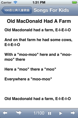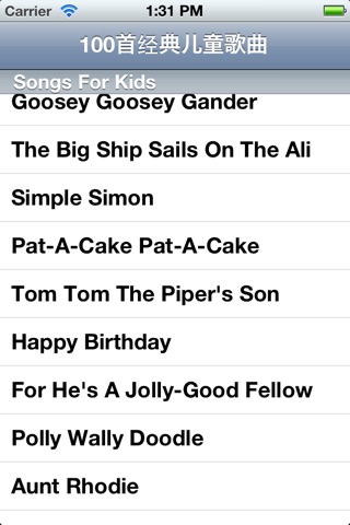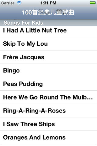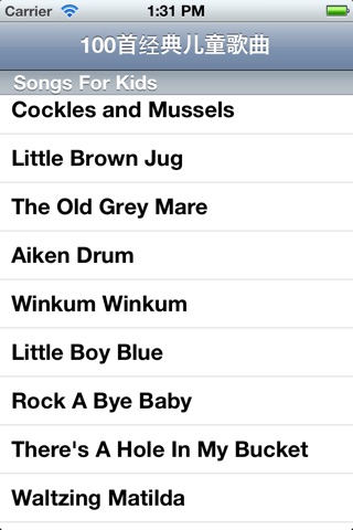 100首经典儿童英语歌曲。旋律优美的经典儿童歌曲, 优美童音演唱, 有歌词, 让孩子可以欣赏、学习英语和英文歌曲。英文儿歌能培养孩子对英语的兴趣, 为将来的学习打下良好的基础。 幼儿阶段是第二语言学习的黄金时期。在这一关键阶段,经典英语歌谣对幼儿学习英语起着非常大的作用。能培养孩子对英语的兴趣;培养孩子的英语语感;提高孩子的口语能力,从根本上解决“哑巴英语”的问题。 Old MacDonald Had A Farm This Old Man The Grand Olde Duke Of York Oh Dear What Can The Matter Be? Yankee Doodle How Much Is That Doggy In The Window? Michael Finigan The Farmer In The Dell Polly Put The Kettle On I Had A Little Nut Tree Skip To My Lou Frere Jaques Bingo Peas Pudding Here We Go Round The Mulberry Bush Ring-A-Ring-A-Roses I Saw Three Ships Oranges And Lemons Goosey Goosey Gander The Big Ship Sails On The Ali-Ali-O Simple Simon Pat-A-Cake Pat-A-Cake Happy Birthday For He's A Jolly-Good Fellow Polly Wolly Doodle Aunt Rhodie Cockles And Mussels Little Brown Jug The That Old Grey Mare Aiken Drum Winkum Winkum Little Boy Blue Rock-A-Bye Baby There's A Hole In My Bucket Waltzing Matilda Incy-Wincy Spider Take Me Out To The Ball Game Daddy Wouldn't Buy Me A Bow-Wow Three Little Pigs Sky Boat Songs Daisy Daisy I'm H-A-P-P-Y You Are My Sunshine God Bless The Moon Humpty Dumpty Rub-A-Dub Dub This Little Pig Happy Wanderer Lullaby And Goodnight Lavender's Blue My Bonny Lies Over The Ocean London's Burning Five Green Bottles On Top Of Old Smokey Mary Had A Little Lamb Ride A Clock-Horse To Banbury Cross To Market To Market There Was A Crooked Man I Was Working On The Railroad T'was On A Monday Morning One Man Went To Mow The Grandfather Clock The North Wind Doth Blow Bobby Shafto Here We Go Luby-Loo She'll Be Coming Round The Mountain Clementine Bluetail Fly Row Row Row Your Boat Billy Boy Home On The Range The Yellow Rose Of Texas Pop Goes The Weasel Do Your Ears Hang Low? Twinkle Twinkle Little Star The Muffin Man Three Blind Mice Hickory Dickory Dock I'm A Little Teapot Hush Little Baby Baa-Baa Black Sheep Boys And Girls Come Out To Play This Is The Way The Ladies Ride Six In A Bed Bye Baby Bunting Hot Cross Buns Jack And Jill London Bridge Is Falling Down Little Jack Horner Little Miss Muffet Lucy Locket Three Little Kittens Little Bo Peep Where, Oh Where Has My Little Dog Gone See-Saw Margery Daw How Many Miles To Babylon? Sing A Song Of Sixpence John Brown's Baby Do You Ken John Peel ?