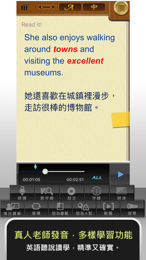 * 本產品由空中英語教室與曉騰國際共同開發 * 英文發音,中英文對照。每月20日發刊,請直接在本軟體內購買(即App Store之In-app Purchase機制),購買後建議使用Wi-Fi下載,以加快下載速度,節省時間與金錢。每期雜誌 NT$120 /含講解課程 NT$180 --------歡迎您訂閱一年期雜誌,實踐每日學英語計畫------- [課文+講解]一年12期雜誌,只要 NT$1,790 *電子書介紹 大家說英語【通用版】同時適用於iPad、iPhone、iPod,讓您無論使用哪一種尺寸的裝置都能享受到行動學習的效率與樂趣。 「大家說英語」是國內發行量最大的英…