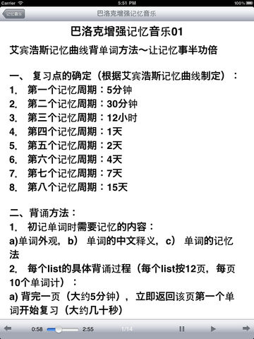 超级学习音乐 是巴洛克音乐中60拍的高频音乐,以这种音乐为背景学习可以让你: 1、快速完成作业,学习速度将提高2—10倍; 2、大脑充满活力,思维敏捷,常有灵感出现; 3、延长注意力集中的时间,提升理解能力; 4、进入最佳的学习状态,沉浸在学习的快乐之中; 5、缓解学习压力,增强体质,激发创造力。 适用对象 1、在校大、中、小学生、研究生、成人高考、自考和职称考级人员; 2、需要大量记忆背诵外语单词、课文者; 3、需要背诵记忆文理科复习题、法律条文、竞赛题者及准备应付各种考试的人员; 4、需要开发学习潜能,提高学习能力的儿童 5、需要记忆符号、图表、密码、字根等各界人士; 6、需要改善提高记忆力的中、老年朋友。 注意事项: 1、本音乐在作背景音乐时,音量控制在30-40分贝左右隐隐约约听见即可; 2、运用超级学习音乐1小时可以完成8个小时学习内容; 3、超级学习音乐让学生创造了每天能学会1200个外语单词的奇迹; 4、激发学生潜能成绩快速提升 ; 5、学习、记忆、考试最有效的助手; 6、让学习速度提升在不知不觉之中。 超级学习音乐导入暗示语 1、可以让你减轻学习压力,集中注意力、增强记忆力; 2、帮助你掌握良好学习技巧; 3、教你怎样做生命韵律的深呼吸; 4、让大脑放松、身体放松,快速让大脑通过语言导入进入学习之波; 5、长期使用能使你思维敏锐、聚精会神。 通过良好的背景学习音乐、优美的语言导入暗示、科学的引导开发。在这样的音乐语言导入的暗示中,能最有效地帮助人集中注意力,使大脑的冥想状态井然有序,促使人神清气爽、思维机敏、开发自我学习潜能。 合集包括: 巴洛克超级学习音乐14首 罗扎夫高效记忆音乐14首 a波记忆音乐8首 1.1版 增加后台支持。 增加iphone5支持。