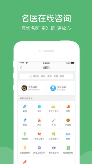 9000万用户正在使用,40万医生在线提供服务,每天33万个问题被解答,3分钟内完成回复的问诊就医平台 [快速问诊] 宝宝发烧怎么办,脸上长痘怎么办,化验单看不懂怎么办,足不出户,拍照传图,3分钟内得到医生回复 [找医生] 50个科室,2000种擅长疾病,40万医生遍布全国,总有一名能帮到你 [健康方案] 远离痘痘、战胜阳痿、缓解焦虑...都能找到一站式解决方案 [有请大医生] 三甲医院顶尖专家的直播互动节目 [自我诊断] 输入症状,智能分析给出诊断意见 [健康工具] 计步器、姨妈助手,记录健康生活 用户评价 1、 来自沈阳的用户 医生都很专业,回复也很及时,给我的父母也都装上了,现在…