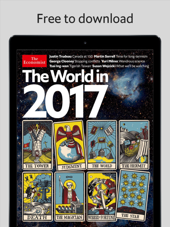 The World in 2017 app contains The Economist’s annual collection of detailed, numerate and opinionated predictions for the year ahead. The World in 2017 features leading figures from politics, business, finance, science, technology and the arts alongside prominent journalists from The Economist and other leading news publications. Download the full app to read contributions by the leaders of Canada and Taiwan who identify their political ambitions for 2017; George Clooney, whose new NGO has a bold approach to ending conflict in South Sudan and beyond; a member of Pussy Riot, the Russian feminist protest group, who anticipates a return to revolution; and the CEO of YouTube, who predicts how the world will change its viewing habits in 2017. The World In 2017 app for iPhone and iPad offers free access to a small selection of articles; within the app you can pay to read the full selection of the magazine’s articles and view related video content. The World In 2017 looks ahead to a new American presidency, a Chinese Communist Party Congress, elections in France and Germany and the political and economic challenges of Brexit, and marks a number of poignant global anniversaries—500 years since Martin Luther published his 95 theses, 100 years since Lenin launched the Russian revolution and 10 years since Steve jobs unveiled the iPhone. In our 31st edition, we include a special section featuring forecasts from 14 globally-minded millennials, ranging from a Syrian refugee-turned-photographer, an iconoclastic Chilean reggaeton artist, one of ballet’s biggest emerging names and leading online voices for young Africans and Muslim American women. Read articles on world news, finance, technology, politics and the arts from: Sadiq Khan, mayor of London; Maria Alyokhina, member of Pussy Riot; George Clooney, actor; Justin Trudeau, prime minister of Canada; Sir Martin Sorrell, CEO of WPP; Susan Wojcicki, CEO of YouTube; Jin Liqun, president, Asia Infrastructure Investment Bank; Hiroshi Mikitani, CEO of Rakuten; Tsai Ing-wen, president of Taiwan; Yvonne Chaka Chaka, singer; Yuri Milner, entrepreneur and physicist; and Ray Dalio, Founder of Bridgewater Associates.