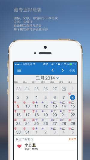 排班表一款好用的排班软件, 通过显示图标和文字到日历(支持农历)以及节假日来帮助有规律轮班的人群解决繁琐的排班问题, 让你轻松掌握你的节日,旅行,约会时刻! • (New!) 状态栏今日插件快速查看今天的排班 • 系统日历同步 • 分享微信,微博 • 完美支持农历节假日(春节,端午等), 公共假日, 以及中国,美国,加拿大,台湾,香港等国家地区的公共假日同时显示. • 增加了11种长闹钟, 你终于可以用它来作为起床闹钟了. • 自由选择排班周期, 时间,上班日期, 通过组合几乎可以排出任何需要的班, 而且非常简单. • 完美支持农历. • 提供20多种不同的闹钟声音供您选择! • 提…