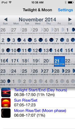 * Featured by Apple as "New & Noteworthy" * The most complete twilight and Moon Calendar. It provides you with the location specific sun / moon data for any date, worldwide. This is a nice planning tool for all outdoor activities. FEATURES: - Moon rise / Moon set Times - Moon Phase Data - Civil Twi…