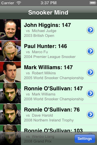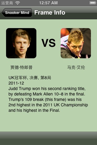 斯诺克是脑力的运动! (收录来自奥沙利文, 希金斯, 亨得利, 丁俊晖, 特朗普, 保罗亨特和威廉姆斯的12局比赛) 斯诺克名局赏收录了世界顶级球手的的精彩名局。它将视频中失真的透视画面还原到俯视视图,你能更好的了解台面上球与球之间的关系,更好地体会球手的选球次序和全局思路。 你可以轻扫或轻击屏幕来浏览击球画面,也可以以幻灯片的方式来欣赏整局。每局球的详细资料也附带在应用当中。 我们会不断添加新的斯诺克比赛来完善你的体验。 关注我们: 新浪微博: weibo.com/snookermind 腾讯微博: t.qq.com/snookermind 推特: twitter.com/snookermind