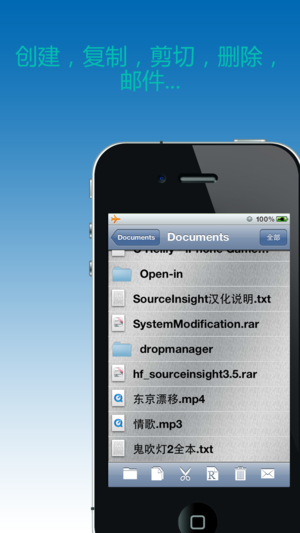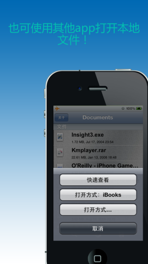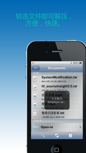 特性: 1. 你可以从邮件,浏览器,或其他支持“打开方式”功能的app中打开RAR, Zip, CBR文件,并在本地解压缩(支持密码解压缩, 分卷解压缩); 同时允许其他app打开本地文件(仅需按住文件的图标不放,“Open-in”菜单就会自动打开)。 2. 支持多级目录, 你能创建文件夹和子文件夹,方便的管理你的文件。 3. 支持重命名,拷贝,剪切,粘贴,删除,邮件等功能。 4. 支持搜索,以方便的找出你想要的文件。 5. 支持大量文件格式的查看 (doc, docx, xls, xlsx, pdf, ppt, pptx, mp3, mp4等等)。 6. 支持打印功能。 7. 支持文件排序(…