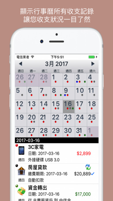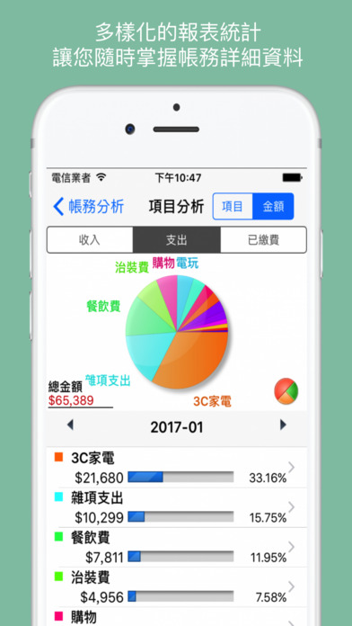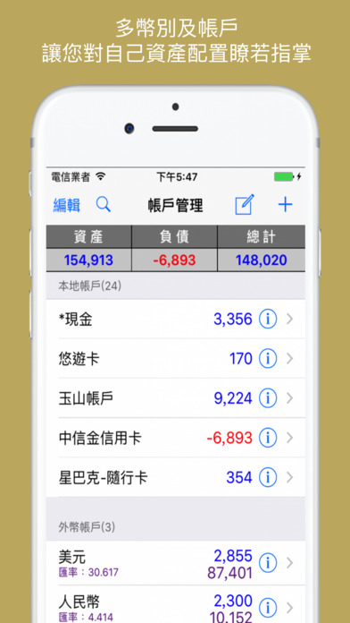 √ 感谢【AppShot智能好程序】研究室专文报导 √ 感谢使用者的支持与肯定 Taiwan 财经分类(Finance) Top Paid No.1 Hong Kong 财经分类(Finance) Top Paid No.1 Macau 财经分类(Finance) Top Paid No.1 √ 支持多国语系(繁体中文、简体中文、English) iMMIG(记账小秘书)特色: iMMIG(记账小秘书)是用于记录个人在日常生活中的收入、支出、缴费数据的软件,让您记账、缴费e次搞定 丰富的列表列表接口,随时掌握您的收入、支出、缴费情形 持续提醒缴费过期功能,每日提醒直到完成、删除该事项或关闭该功能为止,让您不漏缴账单 提醒记帐/备份的功能,让您的资料有更完整的纪录及保存 还有更多贴心小功能,让您管理记录更容易清楚 利用内建的小算盘功能,方便您将计算好的金额直接带入数据,免去重新输入困扰 灵活的预算设定,可依个人喜好方式设定预算 报表统计可随时追踪收入、支出、缴费情形以及收支比对 导出数据 Excel 格式,方便您在PC上做数据存盘、筛选、整理 支持 Dropbox 在线导出、备份、复原数据,使用方便且不怕档案遗失,免去接线的困扰 支持 Apple Touch ID 解锁功能,让您不用麻烦每次输入密码解锁,也不用再担心忘记密码了,若忘记密码,还可以使用 Touch ID 解锁 *********************************** 本软件所有的删除数据功能,皆以滑动的方式删除 在要删除的数据列上,向左滑动的方式删除数据即可 *********************************** 功能说明: 1. 记账功能: 只要简单的操作,就可以帮您快速输入每笔收入、支出、缴费、转账纪录,也可以拍照纪录 2. 缴费功能: 缴费事项可设定重复周期、提醒时间、缴费期限、过期持续提醒等功能,让您不漏缴账单,并可当待办事项功能使用喔 贴心小功能 : (1)许多人在缴账单时多半是先转账再自动扣款.因此在缴费事项修改中, 如果已转账但尚未扣款, 可只选择[缴费日期], 但[是否完成]不要选取, 此时在事项列表中该事项会变为蓝色, 表示您已转账准备扣款, 但尚未扣款, 待真正扣款后, 再修改成已完成即可(2)缴费完成自动抵销帐户金额功能 3. 行事历: 显示所有【收入】、【支出】、【已缴费/尚未缴费】、【转帐】记录,让您收支状况一目了然 (蓝点:收入、红点:支出、黑点:该日尚有未缴费纪录、灰点:该日皆已缴费、绿点:转帐) 4. 小算盘: 内键小算盘,协助您快速计算金额,并可将您计算好的金额直接带入数据,免去重新输入困扰 5. 账户管理: 显示目前资产、负债、总计金额资料 可建立多个账户,且每个帐户皆有余额显示,帐户/项目关闭功能,让您对自己资产配置了如指掌 6. 标签管理 可针对单一特定事件标记纪录,以便统计该事件支出总额,例如:出国旅游、出差费用...等 7. 报表统计: 报表统计可分类别分析、结余分析、圆饼图分析,且可以金额排序,让您随时掌握帐务详细资料 8. 资料导出: 导出 Excel 格式,方便您做数据存盘、筛选、整理 9. 支援 Dropbox: 您可以透过 Dropbox 账号执行汇出、备份、复原数据,使用方便且不怕档案遗失 导出、备份文件位置:Install Dropbox Path Apps iMMIG (例:C: My Dropbox Apps iMMIG ) 10.提醒设定: -可依照個人需求設定預設提醒時間(也可在各筆紀錄設定提醒時間),以及是否過期持續提醒功能 - 记帐提醒功能 - 备份提醒功能 11. 密码锁: 密码锁功能以确保您的个人资料安全 支持 Apple Touch ID 解锁功能 让您不用麻烦每次输入密码解锁,也不用再担心忘记密码了,若忘记密码,还可以使用 Touch ID 解锁 12. 预算设定: 可针对「支出」、「缴费」之(年)(月)(周)(日)预算各别做设定 13. 支援 Apple Watch 让您随时掌握帐务资讯 功能说明: - 可在概览随时查看本周待缴费资讯 - 即时缴费提醒,让您不漏缴帐单 - 随时查看当日收支状况/帐务分析/各帐户结余/资产...等资料 14. 多币别帐户功能 - 本地帐户与外币帐户可互相转帐 - 灵活的汇率输入功能 - 各外币帐户之汇率可自由设定 - 自动计算外币帐户加本地帐户之总资产/负债资讯(资产金额以本地币别为主,如有外币帐户则会自动转换本地金额加总) 如果您有任何问题或建议,欢迎加入我们的FB粉丝团 http://www.facebook.com/JNL.iMMIG