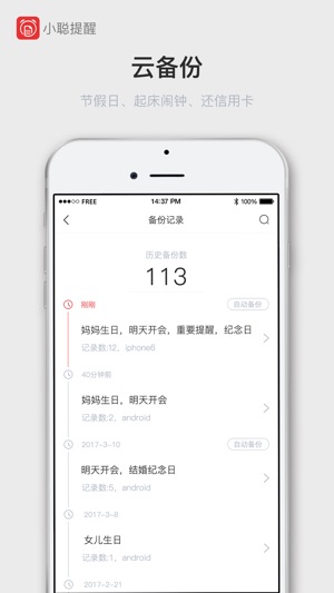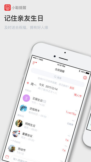 将重要事件记录下来,准时提醒您。让您的生活与工作井井有条。 1、支持各种常用提醒,如:生日、节日、纪念日、起床闹钟、会议、还房贷、还信用卡、尾号限行等。 2、可自定义提醒规则,如:按天提醒、按周提醒、按月提醒、按年提醒等。 3、支持云备份,永远不用担心数据丢失。 4、加密功能,保护您的隐私。 5、支持生日的公历农历转换,自动计算星座生肖。并提供大量生日祝福短信。 6、支持从通讯录批量导入生日。 7、语音识别,说出你的提醒,自动识别内容与时间。