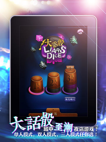 何处大话,哪里骰? 有了“大话骰”,随时大话,随地骰! 大话骰是酒局、聚会、KTV、CLUP 中一款经典群体综艺游戏,因其娱乐性强但又不失益智脑力思考而备受玩家推崇。 但是由于这个游戏要使用到大量的骰子和骰盅,不能随时随地玩,不过热衷于这款游戏的玩家们不要担心,有了“大话骰”,就能立刻把你的IPhone变成骰盅,和朋友玩游戏、猜点数了。 不需要骰子和骰盅,只要带上手机,把IPhone当做摇骰子的骰盅,就可以和身边的朋友如同在party中一样,尽情放纵狂欢,享受游戏的疯狂了。 游戏中,玩家在叫骰时要尽量用大话误导别人,而且还要通过察言观色来识破他人的大话诡计,非常考验猜测与反猜测能力哦,让玩家在彼此的明争暗斗中,获得游戏的乐趣。 游戏说明: >>游戏模式 如果你和你的朋友都有iPhone或者iPad,那么可以免费安装使用单人模式玩。 如果现场只有1台IPhone或iPad,那么可以选择使用双人模式和三人模式,最多3人一起玩! 游戏进行时的大部分操作均可用手势完成,真实感强烈。您还可以探索一下,不用点击,而是去滑动、拖动哦! 同时,游戏还具有防作弊功能,摇好骰子后,骰盅会自动合上,防止其他玩家偷窥。如果玩家忘记了自己的点数,只需点击旁边的金币,就能打开骰盅二次查看啦! >>游戏进行方式 入局的玩家,每人分给骰盅1个,骰子5个,等定位后,玩家摇晃手机进行摇晃骰子的动作,骰子摇定后,看自己的骰子点数,然后猜测对方骰子点数,估算出所有玩家的某个点数总和进行叫骰,互猜各方骰子点数加起来有几颗。玩家对叫骰者叫出的骰子点数产生怀疑时,可以要求所有参与者进行开盅验证。开盅后,如果叫骰者猜对点数,那么叫骰者获胜,怀疑者失败;如果叫骰者猜错点数,那么怀疑者获胜,猜错点数的叫骰者失败。 >>游戏规则 玩家在叫骰时从A个B开始叫,其中A=1、2、3、4、5、……,B=1、2、3、4、5、6。比如玩家可以叫3个4,叫完后,其他人如果不相信这个点数存在,可以“开”所有人的盅。如果所有人的盅里点数相加没有“3个4”,那么选择开盅的人赢,叫骰的人输。如果玩家叫了“3个4”后,其他人相信,可以由其他人继续叫骰,叫的点数必须比“3个4”要大,比如“4个4”或者“3个5”……直到有人不相信,进行开盅,才能判断输赢。 >>特殊玩法 当玩家叫骰时,如果“1点”数没有被喊到,那么“1点”可以作为任何数,也就是“百搭”。例如所有骰盅内共有1个5,3个4点,2个1点,则此时相当于有3个5,或5个4。 >>游戏策略 叫骰时应先采取一些欺骗性策略手段来迷惑对手,这也是大话骰中“大话”这个名字的由来哦,说大话、谎话令对手产生错误的判断,而后按自己的点数真实叫骰,虚实结合,所向无敌。 各位玩家,还在等什么,赶快拿起你的手机,下载大话骰游戏,和朋友们体验游戏带来的狂欢吧! 如果你有任何意见或建议,请找小蘑菇哦! 您的每一条宝贵意见我们都会认真阅读和参考,并以此为方向和动力,从而更加完善我们的游戏。