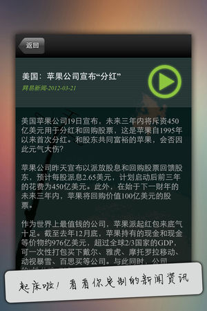 起床资讯闹钟旨在每天的第一时间将最新最丰富的新闻资讯,以闹钟提醒的模式,伴随着优美的旋律将资讯送入您的耳中,无论是时政要闻还是文体娱乐,统统都不会错过。 产品特色: 1.权威客观的资讯内容,包括:新闻,娱乐,财经,体育等多个频道。 2.贴切的广播语音服务。 3.强大的离线下载功能。 4.每日推荐访谈类节目,如《锵锵三人行》、《面对面》、《杨澜访谈录》、《对话》等。 --------------------------------------------- 各位尊敬的用户: 您的宝贵意见和建议是我们提升的最大动力,我们会给大家带来最优质最真诚的产品,感谢各位对我们的支持! 我们会定期进行软件的…