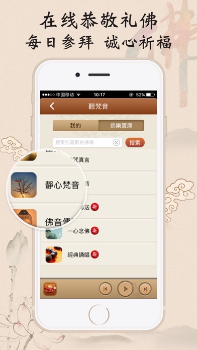 佛经梵音是灵动菩提旗下专业随身弘法应用,为您提供最新的佛教音乐、精彩佛像、佛教经文、佛教早课、晚课等各种最好的修行服务,让您的心与佛祖更加靠近。 传播佛经的智慧,散发佛音的空灵——尽在【佛经梵音】 每天我们都忙着,烦恼像发丝那样,剪不断,理还乱。面对人世间冷暖,迫切的生活,静下心来聆听【佛经梵音】,能让我们都能拥有慈悲,并从中得到健康,更能体会清静。放松神经,聆听内心。 功能介绍 *供养佛主* 随时随地供养佛主,求佛庇佑,确保平安。 *早晚课提醒* 贴心提醒早晚课,不因生活忙碌而忘记诚心参拜佛主。信奉,贵在坚持。 *静心画像* 欣赏精美佛主画像,修心养性,参悟佛道。 *佛音聆听* 沐浴佛音中,整理万千烦恼,内心平静归零面对新挑战。 佛经梵音特点: 1:佛经蕴含经世为人大道理,带给你莫大的智慧,让你的人生不再迷茫! 2:佛教早课晚课,读诵经典,提醒自己,修正自己的行为、思想,增加正能量! 3:实力歌手吟唱佛音,净化心灵,静心修心,功德无量! 4:独具特色的佛像功能,庄严神圣的佛像让你心更沉稳! 5:支持后台多任务播放,让您可以同时进行多种工作! 6:佛陀菩萨常在身边,保佑您幸福安康! 【佛经梵音】通过《般若波罗蜜多心经》、《佛说阿弥陀佛》、《佛说法灭尽经》等多首佛经音乐,以短偈形式赞颂佛与菩萨,其形式有独唱、齐唱或合唱,亦有乐器伴奏,旋律非常优美,不但能感受各地的佛教音乐风格,还能颐养身心。【佛经梵音】是一种打开心灵智慧的声音,也是一种万方佛法护佑的声音,更是一种带来宏大智慧和无尽福运的声音。让我们一起散播佛法,散播爱,佛经梵音与诸位大德广结善缘。 徐健淇老师:活跃在中国原创乐坛的实力歌手,集词 曲 唱 编曲 制作于一身的全能音乐人,他将以真挚的情感和独特的声线让音符进入你的灵魂,情感是人的全部,情歌能让情感自然宣泄,在他的歌声中能听见自己心情的颜色。“地藏王菩萨大愿赞”是2011年金秋最新专辑《瞬间》中的佳作,抒发地藏王菩萨的忘我精神-地狱未空势不成佛。 佛经梵音是灵动菩提旗下专业的礼佛,听佛经,阅读佛经的经典应用. 灵动菩提致力于弘扬佛教文化,传播佛教精神,基于佛家的智慧和思想引领人类学会生活,学会做人,通过学佛修行去除种种错误知见,开启般若智慧,由此证得诸法实相 您只需要在“微信”上通过搜索,找到我们。方式是: 1.添加朋友->查找微信公众帐号->输入“灵动菩提”,确认搜索即可。 2.添加朋友->搜号码->输入“lingdongputi”,确认关注即可。 金刚经网站(http://www.jingangjing.com),为促进社会和谐,以弘扬佛法及佛教文化为己任,同时也为能更好的服务于广大网友和信众,网站不仅提供金刚经全文,经与古本金刚经原文逐字对照,还提供 佛教经文、在线诵经、在线供佛、延寿禄位、往生莲位、在线念佛、静心梵音、免费下载、佛像鉴赏等内容。愿以此功德,普及于一切,我等与众生,皆共成佛道。南无阿弥陀佛! 推荐佛经: 《金刚经》《心经》《地藏经》《普门品》《普贤行愿品》《药师琉璃光如来本愿功德经》《阿弥陀经》《无量寿经》《观无量寿经》《华严经》《妙法莲华经》《楞严经》《念佛圆通章》《耳根圆通章》《八大圆觉经》《僧伽咤经 》《一切如来心秘密全身舍利宝箧印陀罗尼经》《六祖坛经》《大悲咒》《往生咒》《楞严咒》《准提咒》《药师咒》(三大佛之一)《药师灌顶真言》《黄财神咒》)《文殊菩萨心咒》增长智能《金刚萨埵咒》《百字名咒》《释迦牟尼佛咒>(三大佛之一)《阿弥陀佛心咒》(三大佛之一) 读经书过程中与佛友的共勉和共策,能更加有效地收摄我们散乱的身心。在听法过程中,与佛菩萨感应、与大德祖师为伍、与善知识为伴,我们的知见也就不会背离佛法。在道场中与同修们共读佛经,还可以共同分享交流心得体会,这都可以做为正念的加持力。固定的读书与修持,有助于我们正念的恒持,并以此做为恒守觉悟信念的实际行动,让自己时常处在学习的状态中,这才符合求道者必备的基本素质。“流水不腐,户枢不蠹”,正确的学习佛法会令我们的精神饱满而不至流于世俗的腐朽。