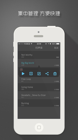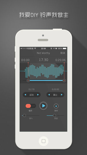 换来换去总觉得自己的来电铃声没有别人的酷? 是不是厌倦了iPhone自带的铃声? 想不想拥有个性化的铃声? 铃声制作利器是一款智能的铃声制作软件,它的页面简约,功能强大。 拥有它你就可以随心所欲的编辑自己的铃声了。你喜欢的歌曲,朋友的笑声,爱人的唠叨都可以出现在你的铃声里! 铃声制作利器主要功能: - 可以制作6秒到40秒不等的来电铃声,以及2秒到20秒不等的短信铃声 - 导入歌曲后可显示真实波形,方便您快速的锁定歌曲高潮 - 支持滑动选择歌曲片段;支持淡入淡出,试听循环播放 - 制作完成的铃声保存在铃声库里,可以将其重命名,也可以通过Email分享给朋友 - 只需要连…