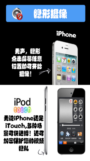 如果你身在博物馆中,正好该场合又禁止拍照,你该怎么办? 如果你在公交车上发现小偷,又不能太过明显的拍下证据,担心后面有同伙看到,你又该怎么办? 如果你是一个记者,采访时对方不允许拍照,你又该如何? 如果……总之,你很多东西想拍下来,却又不能明目张胆的拍的时候,你该怎么办? 试试这款应用吧。隐形的照相机,让你偷拍于无形之中! 跟其他同类应用不同的是,这款应用具有以下几大优势,同时也是别的偷拍应用没有的特点: * 拥有密码保护功能。你可以随时给你的应用加上锁,别人无法看到你里面的东西。 * 拍摄下来的照片或者视频,是直接存放在软件里面,而不是类似其他应用一样存在系统相册,这样可以避免你系统…