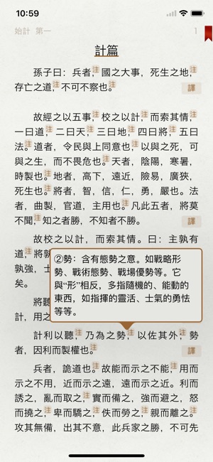 本应用为《孙子兵法》(The Art of War)有声同步版,可听可看, 名家诵读, 文字实时同步, 注释详细,注释与原文分离显示,支持点查,附译文, 以及字典。简繁切换,一书多用:可以聆听充满古韵的朗读;亦可字斟句酌地做为学习之用;亦可以快餐方式的查看译文,快速掌握《孙子兵法》的大意。适合各种人群,值得收藏! 有甚麽特色? 边听边看 正在朗读的文字用下划线标示 文字实时同步 手指双击句子即从指定位置开始朗读 注释详细,并与原文分离显示,支持“点查” 变速朗读 觉得读得快了或慢了都可以调节速度 附带字典 可以查询一些不认识的字词,包含古汉语字典,汉语字典,汉语词典,成语词典…