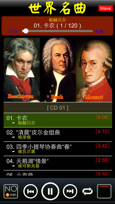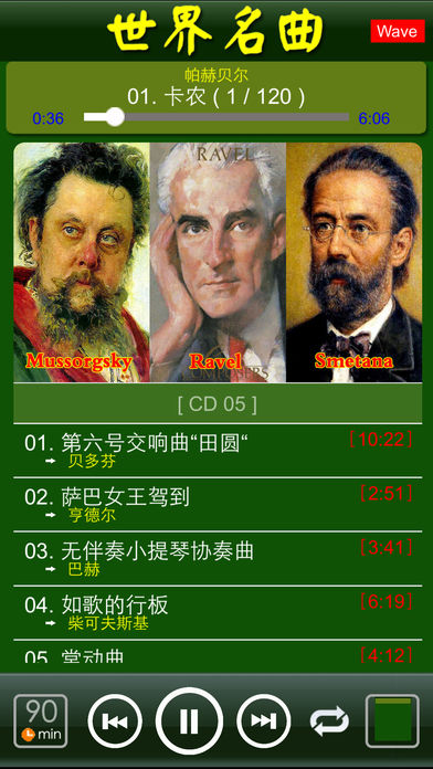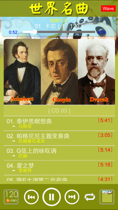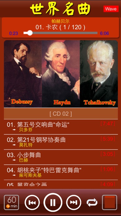 世界名曲10CD 120曲,囊括40位古典音乐大师代表性作品,首首经典,高清音质,黄金珍藏。DD Player,我用心,你好用,创新为你。 DD Player ,Innovation for You. 技术创新点: ▪ 同时支持iPhone,iPad,针对屏幕尺寸单独设计 ▪ 数十款风格(皮肤),选你所爱 ▪ 播放列表按照个人喜好排序. ▪ 支持专辑,强大的专辑管理功能 目录 [01] 01.帕赫贝尔:卡农 02.格里格:清晨皮尔金组曲 03.维瓦尔第:四季小提琴协奏曲春 04.柴可斯夫基:天鹅湖情景 05.莫扎特:小夜曲 06.贝多芬:月光奏鸣曲 07.德沃夏克:第九号交响曲新世界 08.华格纳:女武神 09.卡尔欧菲:布兰诗歌 10.盖希文:蓝色狂想曲 11.亨德尔:水上音乐 12.约翰.施特劳斯:蓝色多瑙河 [02] 01.贝多芬:第五号交响曲命运 02.莫扎特:第21号钢琴协奏曲 03.巴赫:小步舞曲 04.柴可斯夫基:胡桃钳特巴雷克舞曲 05.穆梭斯基:展览会之画 06.莫扎特:法国号协奏曲 07.西贝流士:卡列里亚组曲 08.约翰.施特劳斯:春之声圆舞曲 09.约翰.施特劳斯:维也纳森林的故事 10.勃拉姆斯:大学庆典 11.雷可莱:小鼓 12.圣桑:动物狂欢节天鹅 [03] 01.马斯奈:泰伊思螟想曲 02.拉赫曼尼诺夫:帕格尼尼主题变奏曲 03.巴赫:G骇之歌 04.李斯特:爱之梦 05.萧邦:降E大调第二号夜曲 06.莫扎特:A大调短笛协奏曲 07.佛汉威廉斯:绿袖子幻想曲 08.柴可斯夫基:胡桃钳糖梅仙之舞 09.阿尔诺尼:慢板 10.巴赫:耶稣,人们仰望喜悦 11.圣桑:动物狂欢节水族 12.瓦德菲尔:溜冰者圆舞曲 [04] 01.柴可夫斯基:第一号钢琴协奏曲 02.贝多芬:悲怆奏鸣曲 03.麦尔斯:短歌 04.威尔第:曼陀玲协奏曲 05.莫扎特:第25号交响曲 06.柴可夫斯基:睡美人圆舞曲 07.穆梭斯基:基辅城门 08.柯普兰:众人信号曲 09.威廉斯:奥林匹克鼓号曲 10.门德尔松:乘着歌声的翅膀 11.莫扎特:第41号交响曲朱彼德 12.西贝流士:芬兰颂 [05] 01.贝多芬:第六号交响曲田圆 02.亨德尔:萨巴女王驾到 03.巴赫:无伴奏小提琴协奏曲 04.柴可夫斯基:如歌行板 05.帕格尼尼:常动曲 06.亨德尔:皇家烟火 07.萧邦:即兴曲 08.柴可夫斯基:弦乐小夜曲 09.艾尔加:爱的礼赞 10.德沃夏克:斯拉夫舞曲 11.马斯奈:领袖 12.门德尔松:仲夏夜之梦夜曲 [06] 01.莫扎特:第40号交响曲 02.柴可夫斯基:胡桃钳进行曲 03.苏佩:轻骑兵序曲 04.海顿:降E大调小号协奏曲 05.奥芬巴哈:天堂与地狱 06.比才:阿莱城姑娘法兰都舞曲 07.克拉克:小号即兴曲 08.鲍凯利亚:小步舞曲 09.普罗利菲夫:交响组曲基杰中尉 10.哈尔都量:盖聂剑舞 11.马勒:第一号交响曲巨人 12.霍特斯:行星组曲 [07] 01.巴赫:布兰登堡协奏曲 02.圣桑:第三号交响曲管风琴 03.莫扎特:一个音乐玩笑 04.萨替:第一号吉姆培迪诺 05.萧邦:第三11号圆舞曲 06.维瓦尔第:四季小提琴协奏曲秋 07.德彪西:月光 08.贝多芬:第七号交响曲 09.贝多芬:第八号交响曲 10.门德尔松:春之歌 11.德沃夏克:母亲教我的歌 12.韦伯:邀舞 [08] 01.巴赫:D小调触技曲与赋格曲 02.拉威尔:波丽路 03.勃拉姆斯:第六号匈牙利舞曲 04.理查史特劳斯:查拉图如是说 05.门德尔松:婚礼进行曲 06.莫扎特:土耳其进行曲 07.华尔顿:加冕进行曲 .... [09] 01.舒伯特:鳟鱼五重奏 02.巴赫:第二号管弦组曲 03.萧邦:E大调练习曲悲伤 04.西贝流士:黄泉的天鹅 05.海顿:第94号交响曲警愕 06.海顿:第101号交响曲时钟 07.罗西尼:弦乐奏鸣曲第四号 ... [10] 01.勃拉姆斯:第五号匈牙利舞曲 02.莫扎特:费加罗婚礼 03.科札特:波斯市场 04.艾尔加:威风凛凛进行曲 05.比才:卡门组曲 06.伯恩斯坦:豪勇七蛟龙 07.苏莎:永恒的星条旗 ...