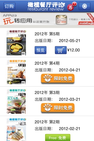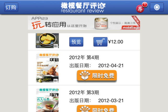 橄榄餐厅评论 作为国内第一本专业的餐厅评论杂志,《橄榄餐厅评论》每月一期,全彩印刷,全国发行,读者是上海、北京、广州等地的商务人士和政府官员以及CBD的美食客。他们是当今高消费、高学历、高感度的“三高人群”,生活有腔调、滋味高要求、25-50岁的职场精英人士,需要应酬,乐于享受生活,渴望在美食中体验感动。 《橄榄餐厅评论》的目标是建立中国自己的餐厅评鉴体系,倡导尊重食物、快乐工作的生活哲学。杂志每两个月还出版增刊《橄榄美酒评论》。 关于本杂志订阅注意事项: 1、橄榄餐厅评论杂志为月刊,一个月一期 2、订阅杂志,您可以选择 .订阅三个月,价格3.99美元或25元人民币 .订阅六个月,价格5…