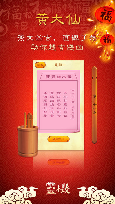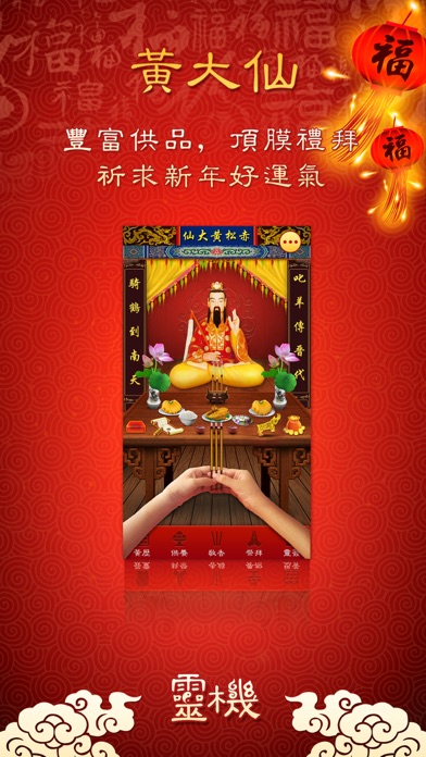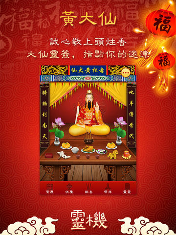 下载《黄大仙祠》应用,黄大仙随时随地在您身边。 2015年最灵验的黄大仙祠应用,随时随地都可以供奉仙人,拜祭贡品数量足,拜祭方式最贴近现实生活,每遇到难事疑惑时,可以进行最准确的摇签测算,为你解答问题。 黄大仙祠特点: 1:随时随地供奉黄大仙,免去舟车劳顿之苦! 2:模拟真实祭拜场景,供奉大仙的诚意尽显! 3:非常灵验的黄大仙灵签,日常占卜必备! 黄大仙俗名黄初平,晋朝丹谿人,年幼家贫,八岁时替人牧羊,十五岁时在故乡金华赤松山遇仙人,进 入福地修炼,终于得成正果。因大仙居于赤松山,所以人称赤松黄大仙《黄大仙祠》是一款集合供奉黄大仙和黄大仙灵签的多功能应用。 依照实际的祭拜程序,给大仙上香和 供品,再上下晃动手机完成祭拜,就似在庙中或家中祭拜一样。黄大仙灵签为您的婚姻,事业,流年,工作,财运指点迷津,解答疑难。诚心祈求,有问必答。一签一问。亦可帮你解答疑难。诚心求问, 摇动签筒,丢掷圣杯,解签,就像在庙内求问。《黄大仙祠》应用可免去你舟车劳顿之苦,拥有《黄大仙祠》应用,大仙随时随地在您身边。 微信灵机提供了各类精准运势测算、专业命理app免费下载、最新鲜命理资讯、大师亲算等多项服务。 想体验最受欢迎灵机命理馆的专业服务,您只需要在“微信”上通过搜索,找到我们。方式是: 1.添加朋友->查找微信公众帐号->输入“灵机”,确认搜索即可。 2.添加朋友->搜号码->输入“lingjimiaosuan”,确认关注即可。 算卦占卜灵接触:http://www.linghit.com