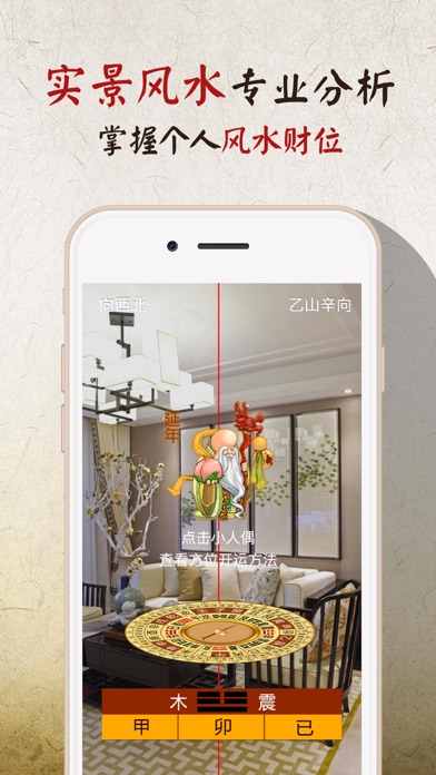**3000个五星用户好评命理应用** **App store最科技化的风水应用** **App store最专业的的测算应用** 采用2017年最新科技研发,利用精确的经纬度加上实景拍摄模拟,然后再专业地计算用户出生八字的开运方位,准确地计算出您的最佳开运位置。 风水实景罗盘特点: 1:科技与传统结合,全面祝你提升运气! 2:切合实际环境,为你实地分析风水! 3:摄像头功能,全方位分析辨别风水! 4:风水百科知识,助你成为风水达人 风水实景罗盘为你详尽地讲解目前你的风水位置,让你更加了解你的前程未来。 新功能介绍: [房间吉凶]:房间吉凶模式是解决住宅各房间布局风水上的问题。例如:大门向南,如果睡房在东方,受睡房影响主人会容易疲劳生病,对自己失去信息,需要使用这个功能调整睡房的风水,破除睡房的负面影响。 [流年方位]:流年方位模式是分析住宅中吉凶方位,调整流年风水影响。例如:今年东南方是文昌位,想要工作顺利,提升个人运势,就要调整东南方的风水。此外建议自建、改造住宅的朋友使用此功能去规划住宅。 [住宅平面图]:住宅平面图模式可以精准分析出住宅中每个位置的吉凶情况,想要生活美满就要善于利用住宅中的每个吉祥位置,该模式需要有一张住宅的平面图才能使用。 风水之学又叫堪舆之学,是我们中国流传下来的相地之术,中国风水学的形成由来已久源远流长,可以追溯到远古时代。风水的核心思想是人与大自然的和谐共存,了解自然环境,利用和改造自然,创造良好的居住环境。风水位置影响着一个人的身心状态,处在一个好的风水环境里,人的各种命理运程也会跟着改善。可是你知道一个人的生辰八字也会与他的环境风水有密切的联系么,不同命格的人适合不同的风水,好的风水都是相对其个人而言的。 当你的命格与你的风水现成相辅相成的最佳状态时,你不仅可以提升环境积极能量,还可以使人的思维清析,安神养性,保持和谐的精神状态。古代风水大师通过磁场感应,精心制作了风水罗盘来,给大家寻找最好的风水宝地,而如今时代发展,更加精细更加准确的罗盘诞生了,风水实景罗盘。 风水实景罗盘利用现在科技与传统风水理论相结合,通过不一般的方式来计算最适合你的风水位置。风水实景罗盘需要记录你的出生年月,然后与你的居家房子大门的所对位置纬度进行深入匹配,为你详尽地讲解目前你的风水位置。让你更加了解你的前程未来。