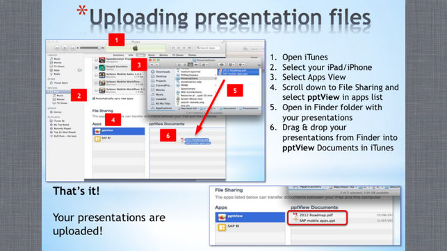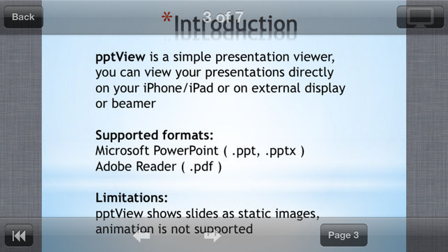 Presentations viewer for Microsoft PowerPoint presentations (".ppt",".pptx",".pps",".ppsx" ), OpenOffice/LibreOffice presentations (".odp" ) and PDF files. Main features: - (NEW!) automatic synchronization with your Dropbox account (Find your files at path Dropbox/Apps/pptView) - viewing presentati…