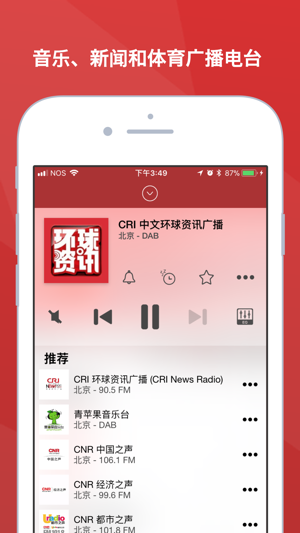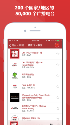 【顶尖全球电台收听软件 - 倾听中国,玩转世界】 同时拥有最海量中国及国际电台的广播软件 【已获众多应用评测媒体推荐 !】 - 微信公众号「爱屁屁」·APPNZ.COM 应用评测媒体重点推荐! - 「少数派」高质量精品应用推荐 【即刻下载,立马收听!】 HIT FM劲曲调频、北京音乐广播、中国之声、轻松调频EZ FM、上海动感101、北京新闻广播、青檬音乐台、CRI都市流行、广西音乐广播、音乐之声等知名广播电台。 【收听 200 个国家和地区 40,000 个最火的广播电台】 体育、新闻、音乐和文化 — 收听所有种类及语言的最佳电台软件。 现在无论您是在家里、在办公室、等公交、上班…