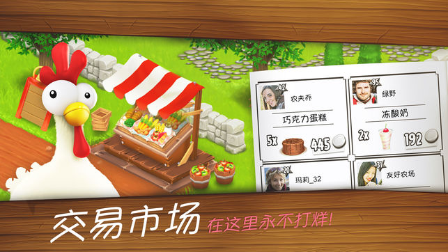 史上最棒的农场,耶!欢迎来到《卡通农场》——霸占122个国家游戏排行榜上第一名,手机和平板电脑上人气最旺的农场经营游戏。 熟悉地形,照料作物,与友邻交易物品。这是个特别的地方,从不降雨,但农作物却永不枯萎。与习性各异的小动物们一起享受快乐的农场生活,其乐无穷! 请注意:卡通农场(Hay Day)可免费下载、安装,您也可以用真实货币购买一些游戏物品。如果您不想使用此功能,请在设备设置中关闭APP内购买。进行游戏需要连接网络。 ~~~~~~~~~~ 游戏特色 ~~~~~~~~~~ * 拓展您的农场,个性化设计布局 * 通过您的路边小店,与友邻交易农作物和新鲜农产品 * 使用卡车或货船完成订单…