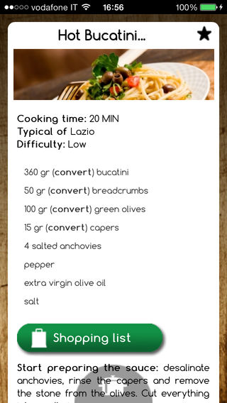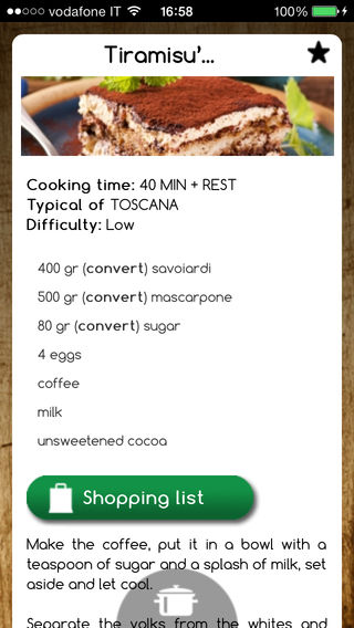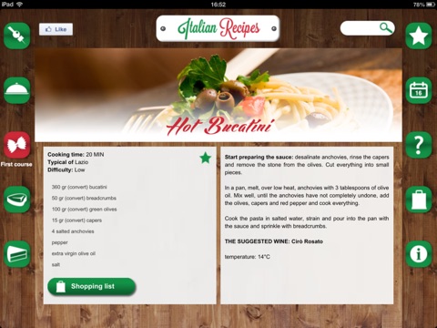 +++++ TODAY special price +++++ Download it now! It's THE BEST APP for ITALIAN FOOD. Become a real Master Chef. In this APP you will find Italian Recipes, very tasty and easy to prepare. New recipes every day. You can try traditional Italian Recipes, Recipes for Appetizers, Main Courses, Main Dishes and Desserts. There are Recipes for everyone, fast and easy to cook. Easy Cooking with this app!! Typical Italian Regional, Recipes for Appetizers, Stews, Main Dishes, First Courses, Second Courses, and Desserts. Italian Recipes are suitable for all, for adults and children. You'll find Recipes with Vegetables, Meat, Fish, Eggplant, Asparagus, Zucchini, Pumpkin and much more. Italian Recipes is an application with Recipes suitable for Summer and Winter. Quick and easy Recipes. Some recipes: APPETIZERS: Salt brioches with cheese Savoury cake with spinach and ricotta Cheese focaccia Ham grissini Stuffed cherry tomatoes Rice arancini Parmesan and pecorino cookies Sweet and sour small onions Russian salad Aubergineballs Fried sage Stuffed eggs fettuccine with pumpkin and bacon Ricotta gnocchi with tomato Risotto with pumpkin Onions soup Fusilli with chicory cream Penne with cream and cooked ham Vegetable soup Seafood rice Rice salad Farfalle with saffron Broccoli and lentils soup MAIN COURSES: Coconut milk chicken Stuffed courgettes with saffron Fried mashed chicken Meat salad Roast bass Milk roast meat Chicken cream Stewed rabbit Slices of meat with tomato Breast of chicken with mustard and sweet herbs Stuffed peppers Lemon escalopes ALL-IN-ONE COURSES: Chicken pie Fried gnocco Lasagne bolognese Polenta with cheese Meat roll Quiche with vegetables and bacon Vegetable strudel Vegetables omelette Peperonata Stuffed toasted sandwich Chicken with vegetables Mixed salad DESSERTS: Berries pie Carrots cake Lemon and strawberry cheesecake Apple Almond and raisin cookies Chocolate cookies Cherry muffins Lemon Chocolate shake Apple chips Fruit salad Lemon ice cream .... and much more !!!! +++++ TODAY special price +++++ Download it now!