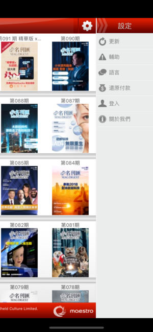 《名刊匯》為馬己先國際(亞洲)有限公司出版的電子中文雜誌,以薈萃海外名刊精華和擴闊讀者視野為宗旨,從《時代》、《財富》、《彭博商業周刊》、《讀者文摘》、《Jetsetter》、《Business Traveller》和《商業評論》等著名雜誌精選焦點專題故事、全球熱話、各方潮流大勢等。主題包羅萬有,包括政治、商業、財富、趣聞、科學、技術、旅遊、健康到育兒資訊。讓讀者可以輕輕鬆鬆,在最短時間獲得最新、最多、最獨到的資訊。 《名刊匯》內容廣泛,包括: 風雲篇:網羅全球大事和重要時事資訊 財富篇:全球經濟大勢和企業最新發展盡掌握 經營篇:企業管治和銷售要訣全披露 萬花筒:涵蓋旅遊、文化、健康等精彩內…