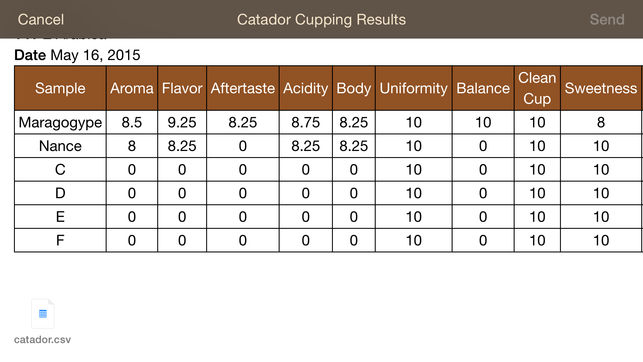 Catador replicates the industry standard SCAA coffee cupping scoresheet with an easy-to-use system of sliders to rate sensory criteria and tick boxes to mark off-cups in the categories of Uniformity, Clean Cup and Sweetness. Touching the Notes line launches a virtual keyboard so that you can recor…