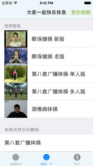 定时休息利器,办公族必备保健应用 -------------------------------------------------- 长期坐办公室的人们,你们的脖子疼么?眼睛疼么? 你们应该经常活动,可是工作一忙往往就会忘了活动,怎么办呢? 本应用可以定时提醒你起来活动,并内置有第八套广播体操视频教程、眼保健操视频教程、颈椎病预防视频教程。 工作再忙,也不要忘了定时起来活动一下。 --------------------------------------------------- 白领人群往往长时间面对电脑办公,久坐的危害日益侵蚀着白领的健康…