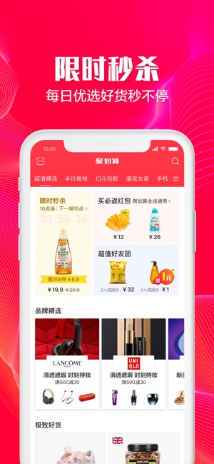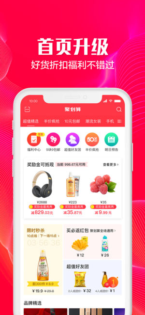 聚划算是阿里巴巴集团旗下平台,由淘宝、天猫的优质商家开展网络精选推荐活动,覆盖女装、男装、母婴、食品、日用品等多种品类,为你提供高性价比的商品。 ——特色频道,惊喜不断—— 1、新人特权:新人专属特权50元奖励金免费领,专区购物直接抵现 2、限时秒杀:网罗各类限时特惠商品,每天3场秒杀,超值低价量大价好又省心 3、买返红包:每单购物必返红包,聚划算APP全场通用 4、半价疯抢:每天10点限时第二件半价抢,品质价格双保障 5、签到红包:每日签到赚红包,大牌优惠券免费领 ——品质用户的购物之选—— -“那个奖励金有点牛逼的,我丢到一个群里,就多了120块,这一波操作可以的,买了一堆蜂蜜和面膜,…