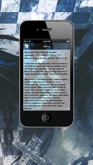 Hi Welcome to BRS ! Black Rock Shooter Wallbook Anime This Application for Black Rock Shooter Fanclub This Application collects many details for BRS Fanclub such as - Wallpapers - Camera - Postcard - Synopsis - Character details - Agent site (Website,BBS,Forum and Shoping Item and Accessory) - Sharing and Social network