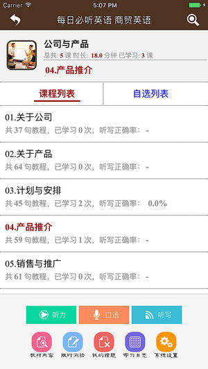 商贸英语是以适应职场生活的语言要求为目的,内容涉及到商务活动的方方面面。商务英语课程不只是简单地对学员的英文水平、能力的提高,它更多地是向学员传授一种西方的企业管理理念、工作心理,甚至是如何和外国人打交道,如何和他们合作、工作的方式方法,以及他们的生活习惯等,从某种程度上说是包含在文化概念里的。每日必听英语,是国内最受欢迎的开放式英语学习平台,实现声音和文字同步播放,让您迅速提高英语听力和口语,攻克英语学习难关! 【软件特色】 * 每日听力,超大文本同步显示。强大播放工具,支持全屏,单句或全文循环,5种语速设置等 * 口语训练,自动评估发音。每天15分钟,彻底告别哑巴式英语 * 听写练习,…