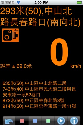 测速照相侦测程式 ,内含国道丶平面丶高架,固定测速照像机的座标,不定时透过应用程式升级的方式更新 软体特色 : ◎ 资料准确丰富,团队维护更新,也可自行新增删除像机 ◎ 靠近照像点,语音提示距离与限速,不用时时分心看画面 ◎ 电子罗盘,显示车行方向与车速 ◎ AGPS,立即定位,又兼具传统GPS精确之优点 ◎ 独家显示定位误差范围,坏天气的影响一目了然 ◎ 智慧型未移动节电设计 ◎ 港台提供平面市区(橘),高架快速(蓝)骑机车专用模式(绿) ◎ 支援背景执行模式,在使用iPhone其他程式时,仍可执行警示 ◎ 结合iPod 音乐播放的贴心设计 ps:程式在背景仍使用GPS,會消耗您手機的電力,我們會在您十分鐘內未移動超過500公尺的狀況下,主動關閉GPS並提示您。 使用說明: 1.使用前請從手機設定處,打開iPhone的定位功能且允許程式取得您的位置。 2.確定聲音是開啟的狀態並調整適當音量。 3.下方選單可切換不同模式,觸摸螢幕會出現最近一支像機的照片,雙擊螢幕會出現像機維護的選單 4.在確定有定位及音量的狀態下,駕駛中,遇到像機,程式就會提示。 5.手機設定需允許程式推播通知,才能在背景中執行偵測通知 iPhone 定位系統精確度,與天氣及行動基地台的位置有關,本程式之提示,只供參考,一切以實際路況為主,請自行注意行車安全,本公司不負任何賠償損失。 (使用手機架置於前車窗在無遮蔽物的天空下可得到最佳效果,在取得衛星定位的情況下,將會顯示車速及車行方向 ,誤差範圍xx米,代表定位的誤差距離,越小越好) 提示時機:當車速高於 60km/h ,將於靠近前300米時提示,40Km/h為200米,否則於100米前提示 上國道高速公路後,建議切換至高速公路模式(藍色),可減少交會市區道路的像機干擾 機車族也可將iPhone放包包中戴耳機使用, 本程式已結合iPod音樂播放功能, 當靠近像機時會以警示音提醒您(放在包包時, 因無法收到衛星定位, 只靠手機基地台定位, 精確度較差), 畫面會顯示附近2公里之內的像機離您的距離及裝置,最上方一行是離您最近的那支,當距離少於300米時,會以黃色來警示 本程式經啟用後即使於背景中也會保持GPS開啟狀態,不使用時請關閉GPS以節省電力Continued use of GPS running in the background can dramatically decrease battery life. 有任何使用上的問題及建議,歡迎至facebook粉絲團 http://www.facebook.com/SpeedCamera 留言